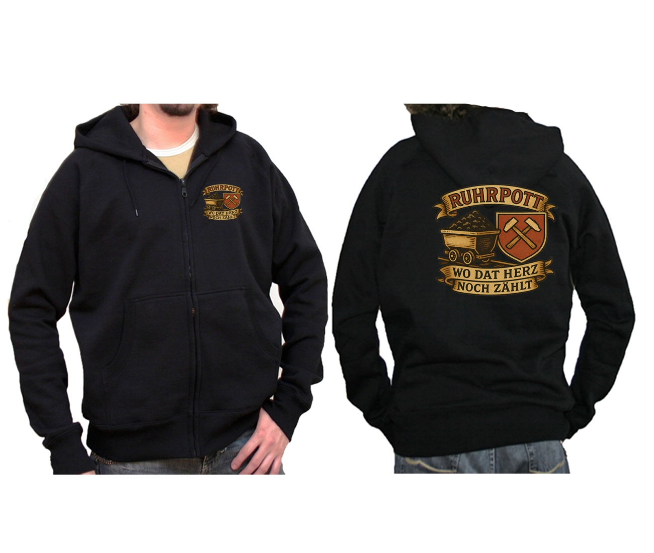 Sweatjacke/Kapuzenjacke vorn und hinten mit Ruhrpott-Motiv: Ruhrpott Wo dat Herz noch zählt