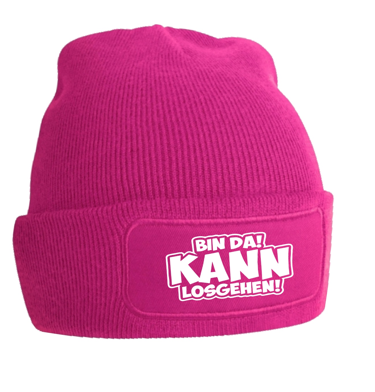 Doppellagige, gestrickte Wollmütze mit Motiv: Bin da! Kann losgehen!